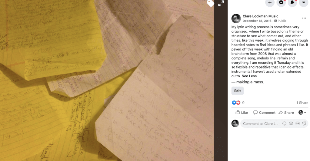 I took a few days digging for lyrics for a few different songs in my writing files. I thought these lyrics fit in nicely, over the melody: dried up dripping, hanging thoughts/ clinging to the shells and rocks. I was 25, teaching alone in Korea during a dark winter, and isolated. I scrapped the melody to the earlier song, and used the lyrics for the new one.